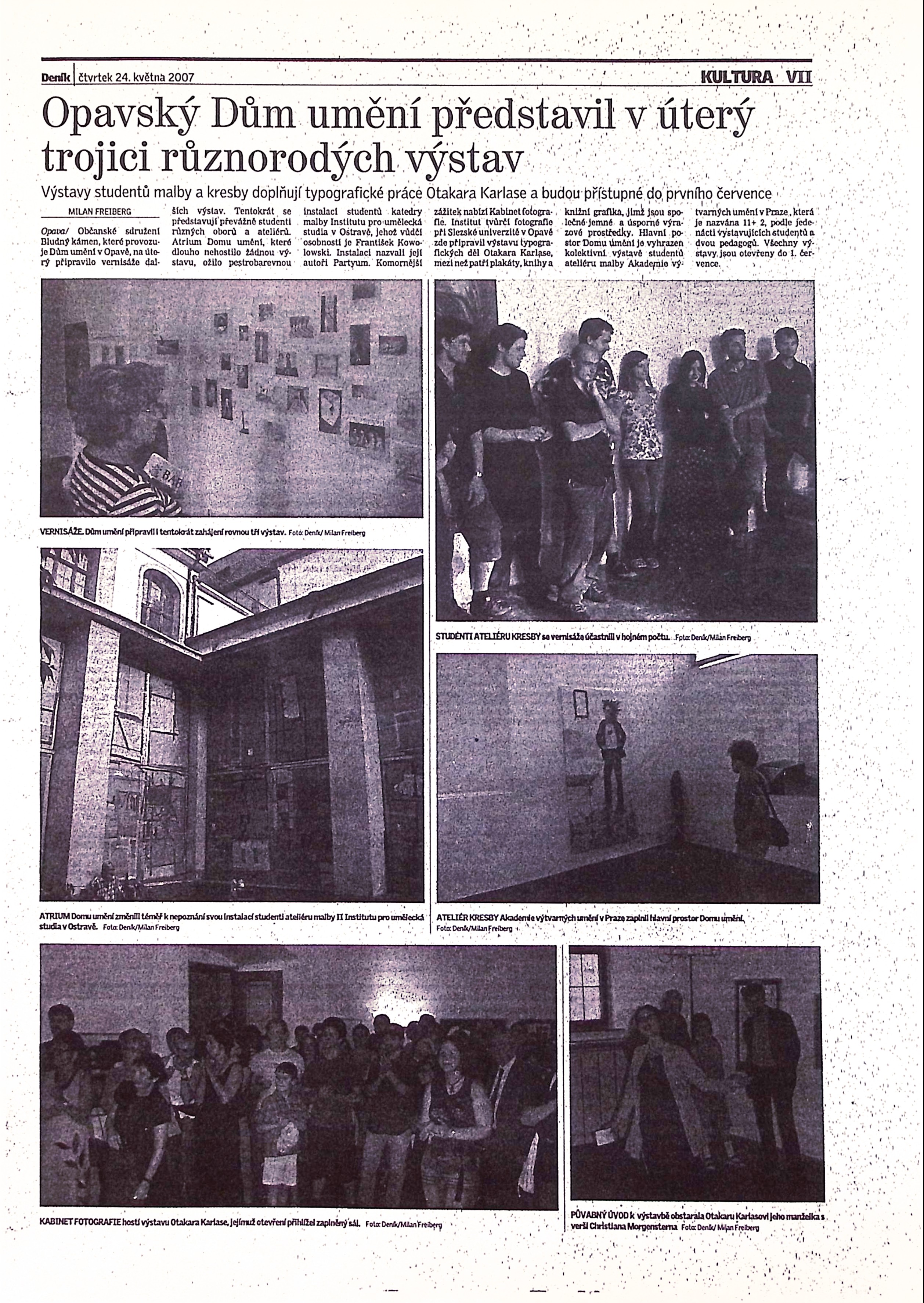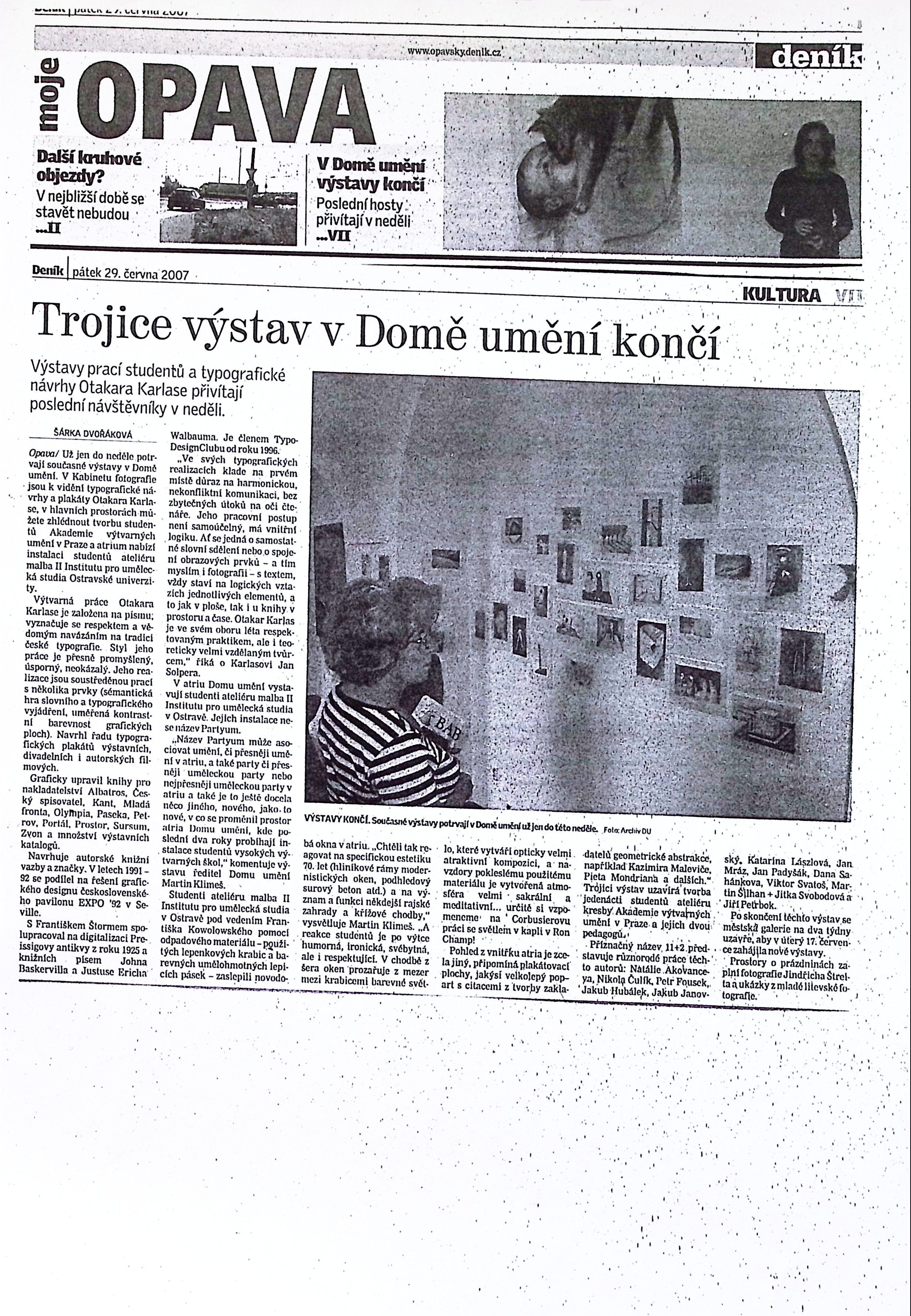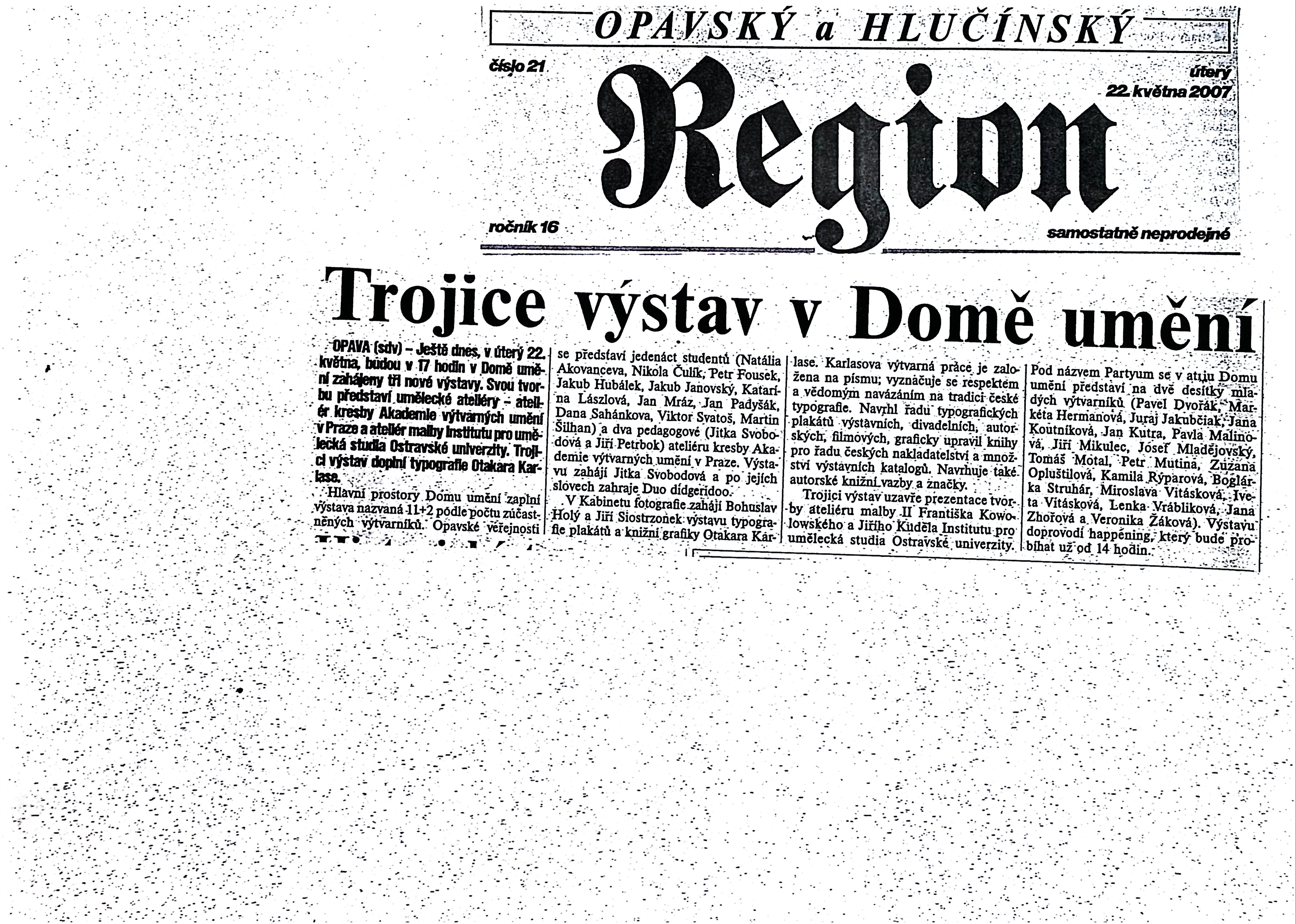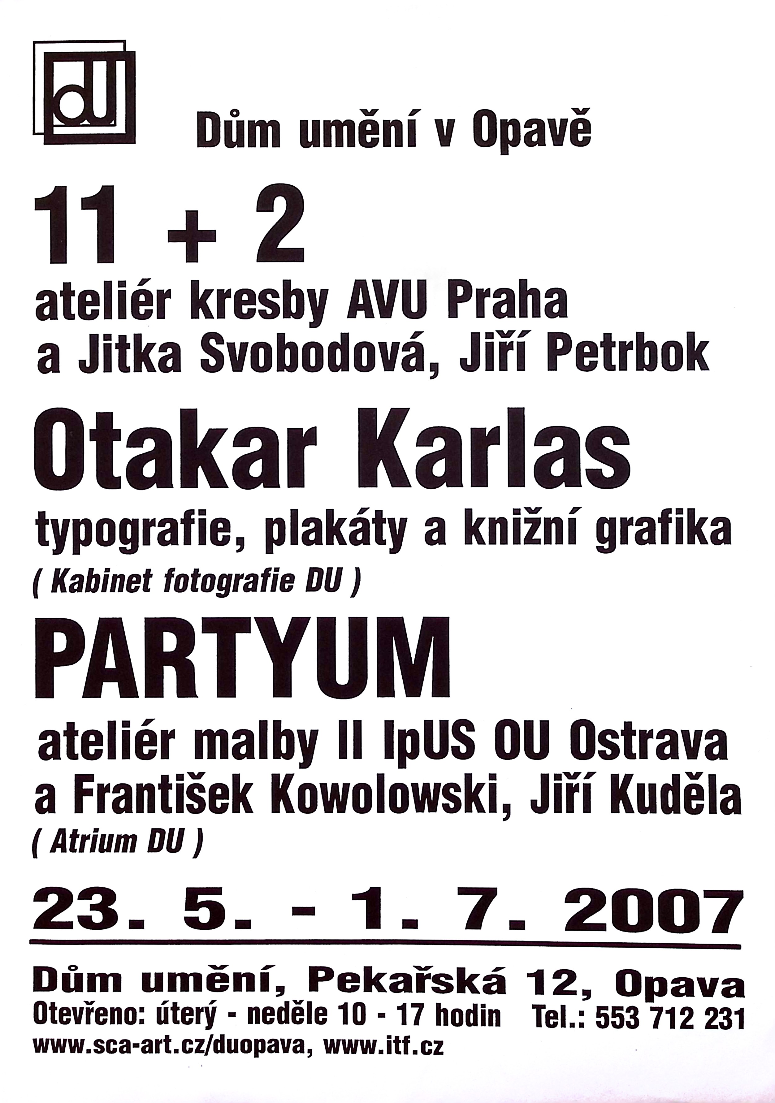 11 + 2 ateliér kresby AVU Praha - Natálie Akovanceva, Nikola Čulík, Petr Fousek, Jakub Hubálek, Jakub Janovský, Katarína Lászlová, Jan Mráz, Jan Podyšák, Dana Sahánková, Viktor Svatoš, Martin Šilhan a Jitka Svobodová, Jiří Petrbok, Otakar Karlas - typografie, plakáty a knižní grafika, Partyum - František Kowolowski, Jiří Kuděla a ateliér malby II. IpUS OU Ostrava
