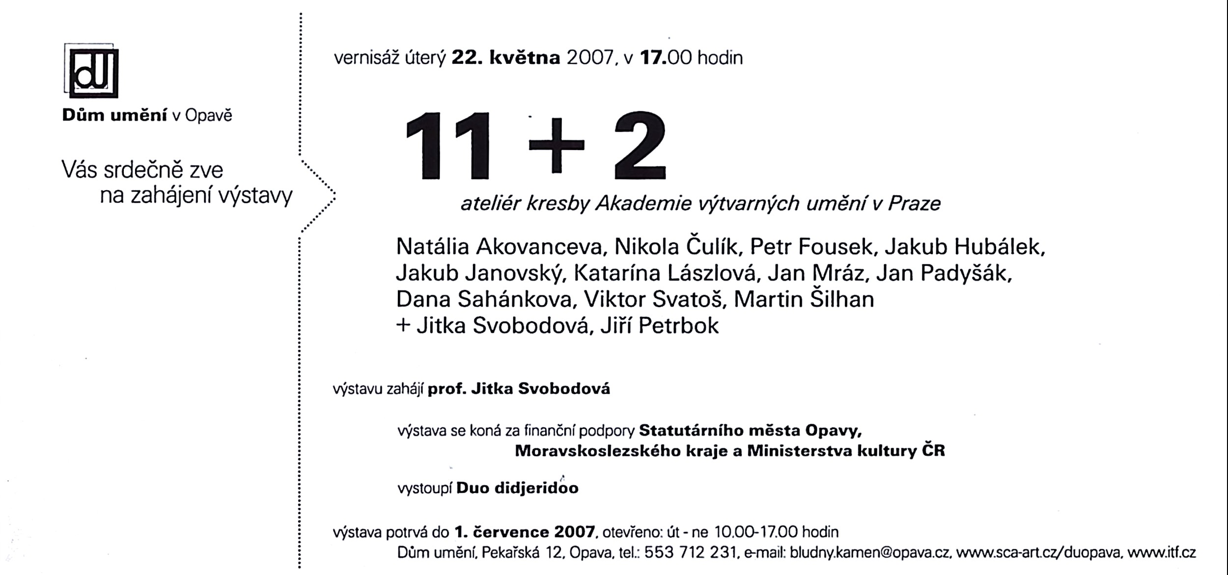 11 + 2 ateliér kresby AVU Praha - Natálie Akovanceva, Nikola Čulík, Petr Fousek, Jakub Hubálek, Jakub Janovský, Katarína Lászlová, Jan Mráz, Jan Podyšák, Dana Sahánková, Viktor Svatoš, Martin Šilhan a Jitka Svobodová, Jiří Petrbok