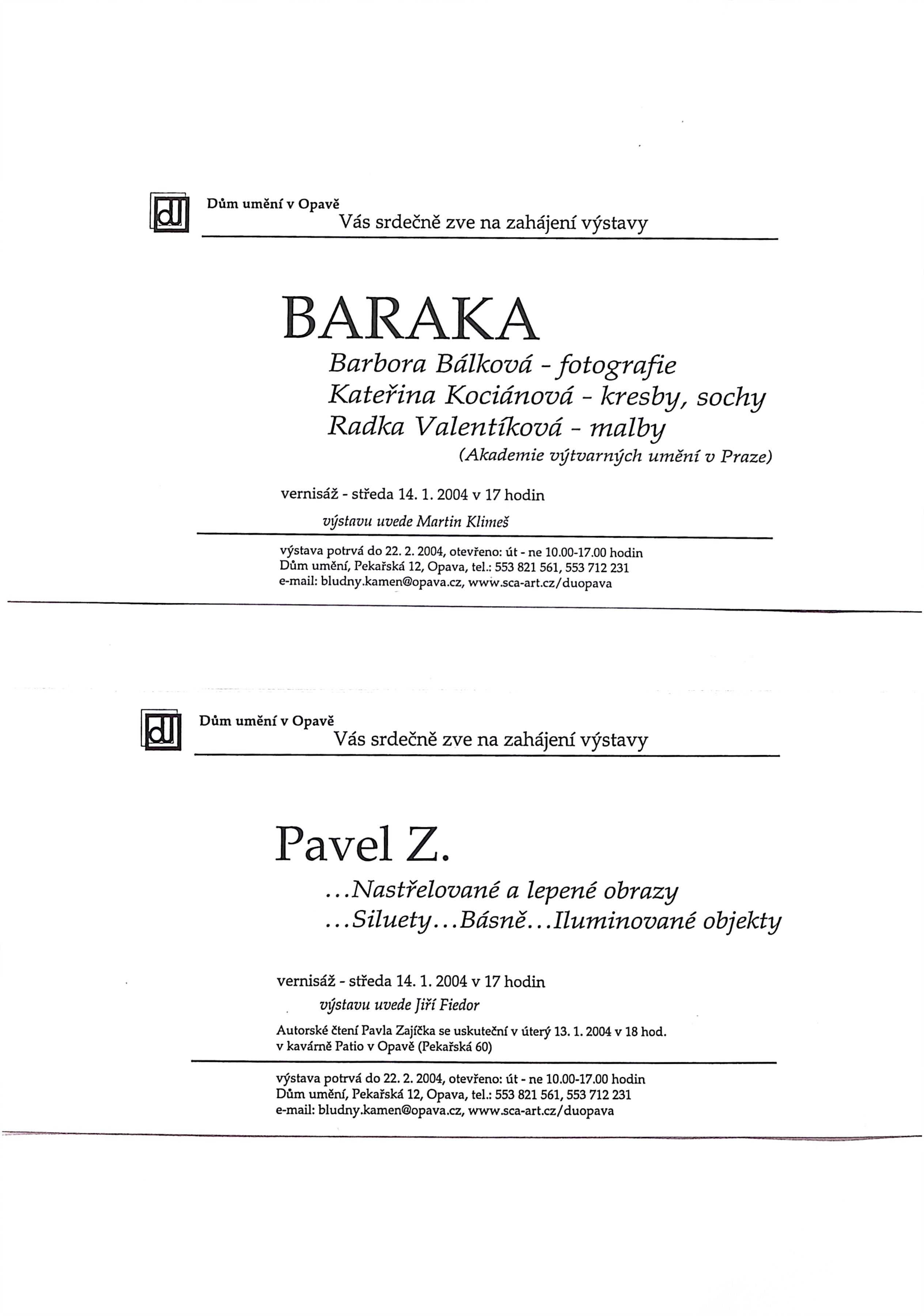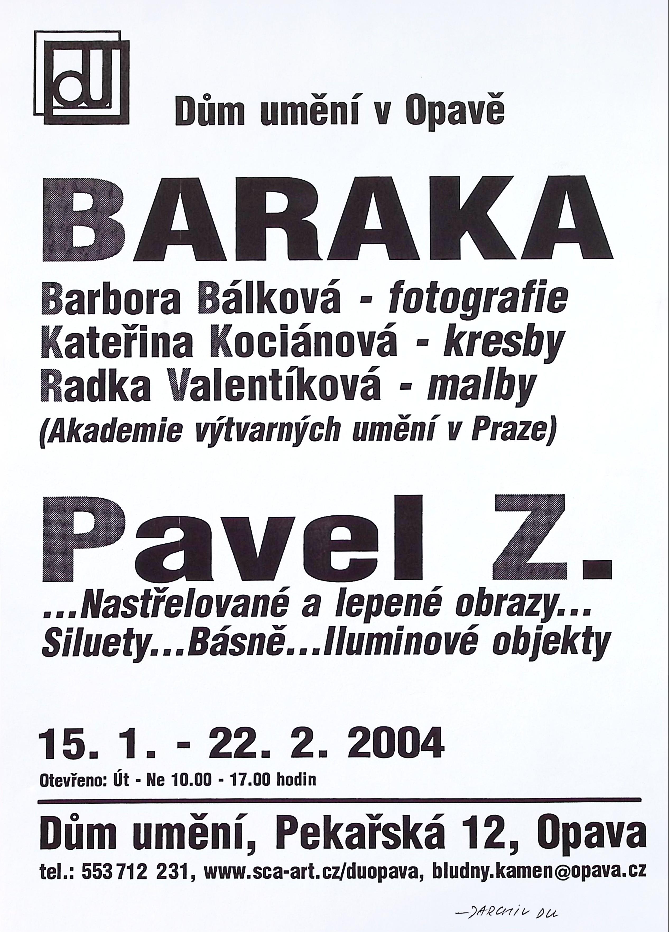 BARAKA - Barbora Bálková - fotografie, Kateřina Kociánová - kresby, sochy, Radka Valentíková - malby, Pavel Z. - Nastřelené a lepené obrazy, Siluety, Básně, Iluminované objekty