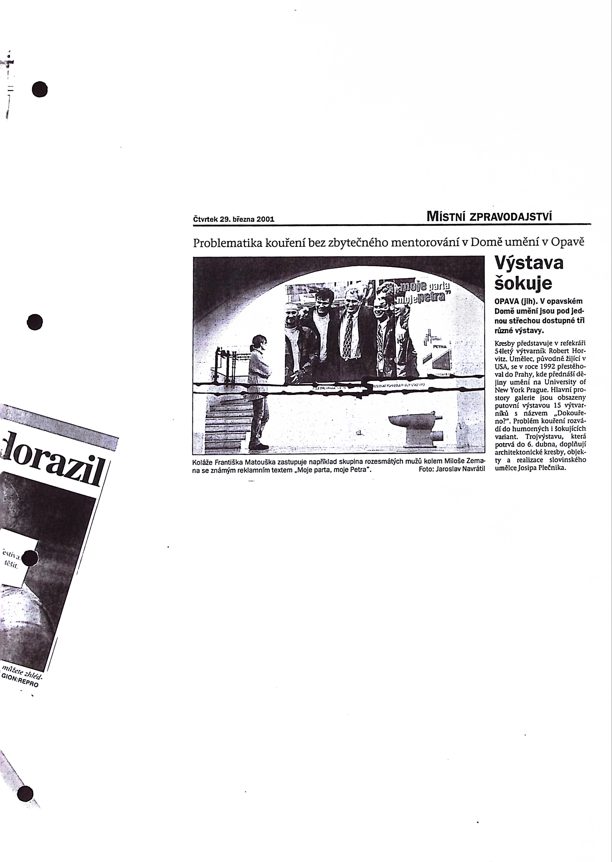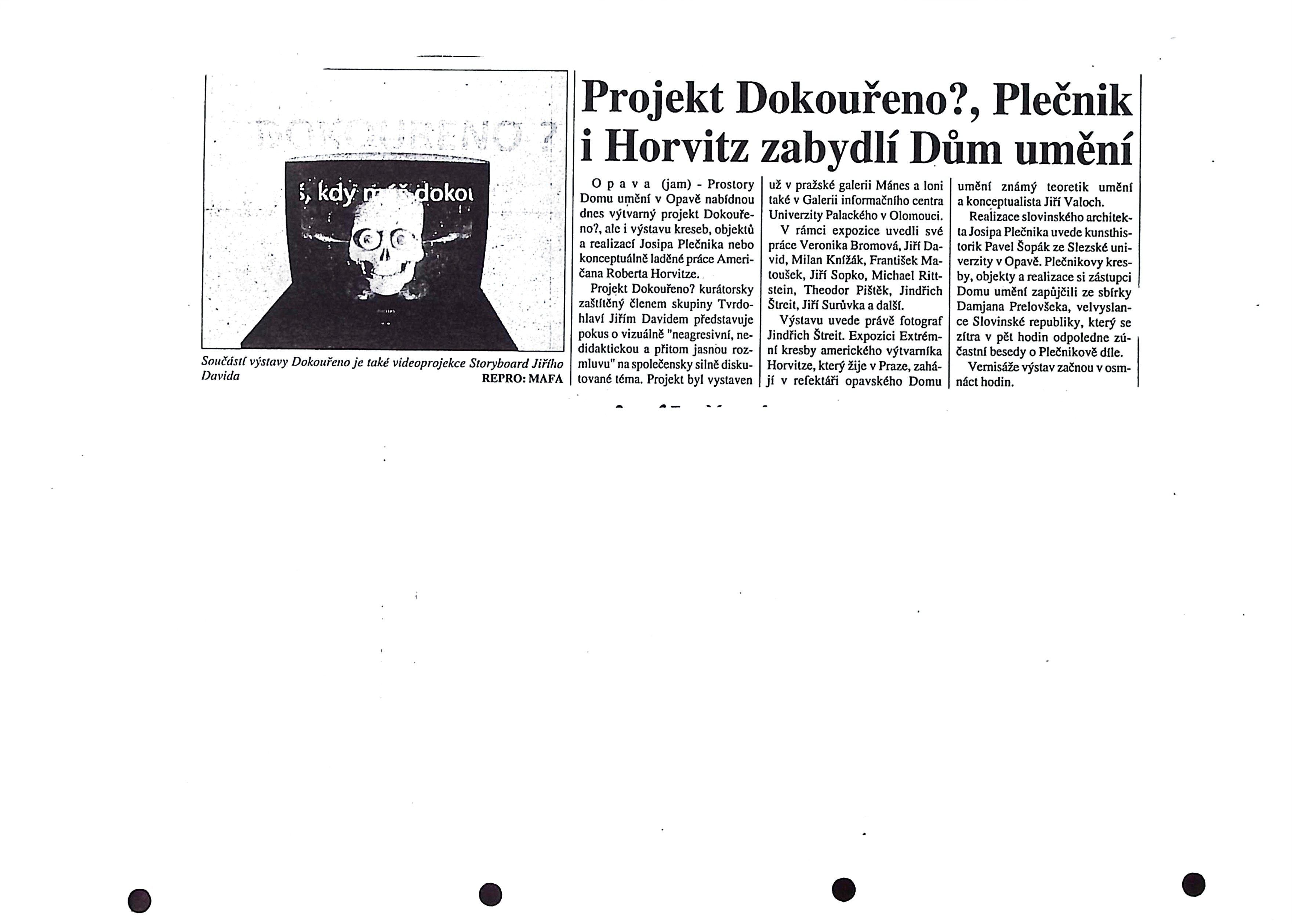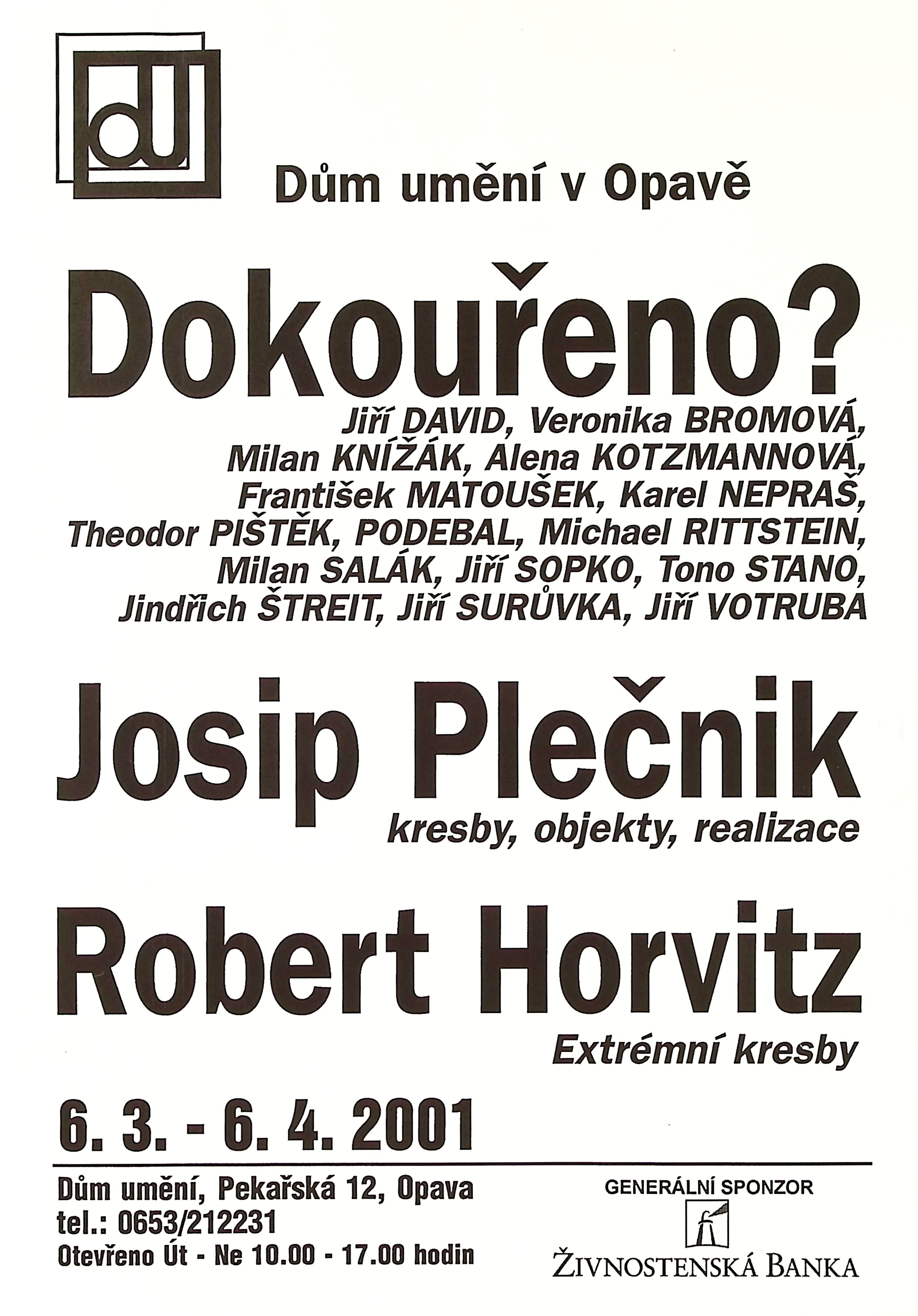 Dokouřeno? - Jiří David, Veronika Bromová, Milan Knížák, Alena Kotzmannová, František Matoušek, Karel Nepraš, Teodor Pištěk, PODEBAL, Michael Rittstein, Milan Salák, Jiří Sopko, Tono Stano, Jindřich Štreit, Jiří Surůvka, Jiří Votruba / Josip Plečnik - kresby, objekty, realizace / Robert Horovitz - Extrémní kresby