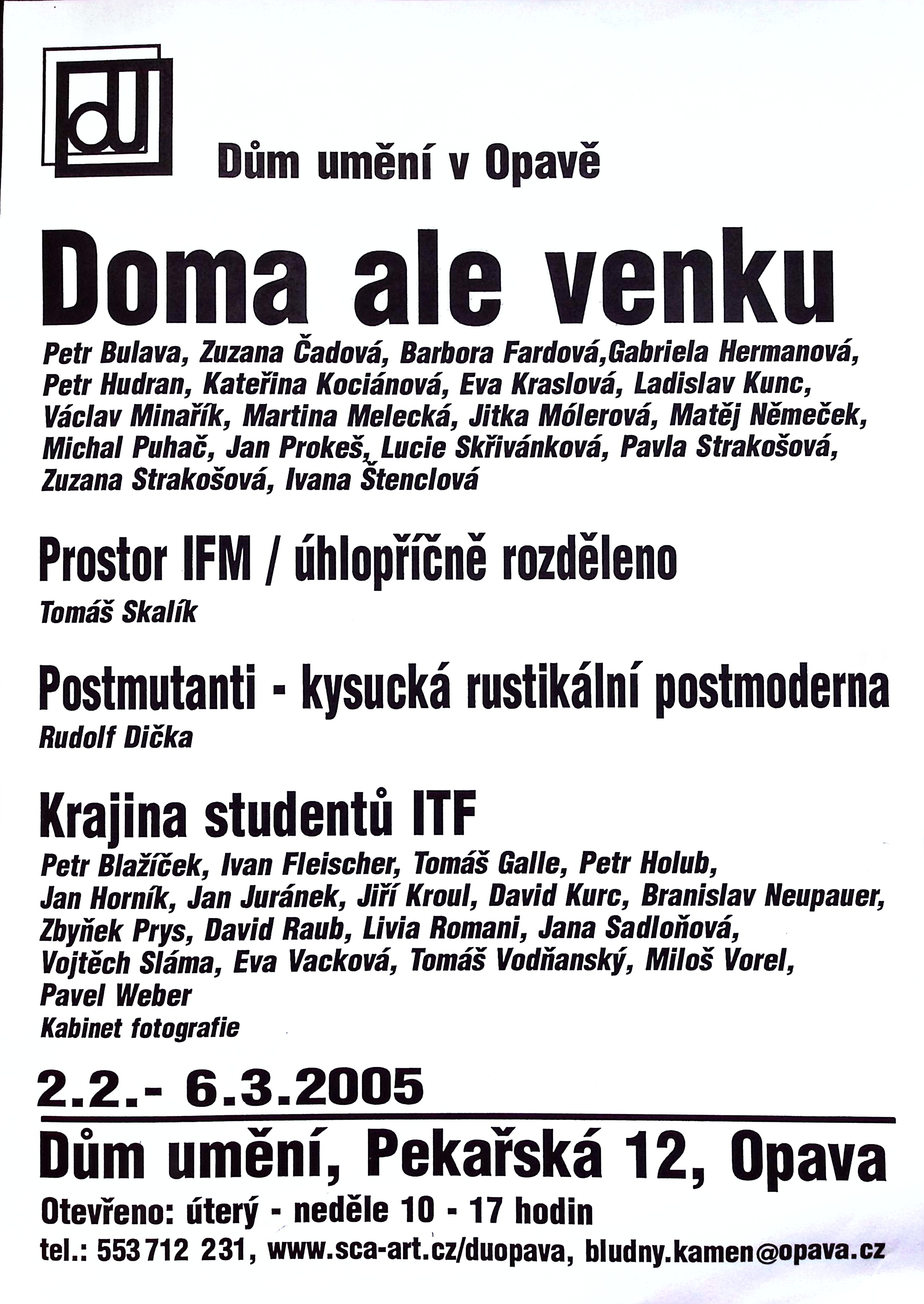 Doma ale venku - Petr Bulava, Zuzana Čadová, Barbora Fardová, Gabriela Hermanová, Petr Hudran, Kateřina Kociánová, Eva Kraslová, Ladislav Kunc, Václav Minařík, Martina Melecká, Jitka Mólerová, Matěj Němeček, Michal Puhač, Jan Prokeš, Lucie Skřivánková, Pavla Strakošová, Zuzana Strakošová, Ivana Štenclová, Prostor IFM / úhlopříčně rozdělěno - Tomáš Skalík, Postmutanti - kysucká rustikální postmoderna - Rudolf Dička, Krajina studentů ITF - Pert Blažíček, Ivan Fleischer, Tomáš Galle, Petr Holub, Jan Horník, Jan Juránek, Jiří Kroul, David Kurc, Branislav Neupauer, Zbyněk Prys, David Raub, Livia Romani, Jana Sadloňová, Vojtěch Sláma, Eva Vacková, Tomáš Vodňanský, Miloš Vorel, Pavel Weber