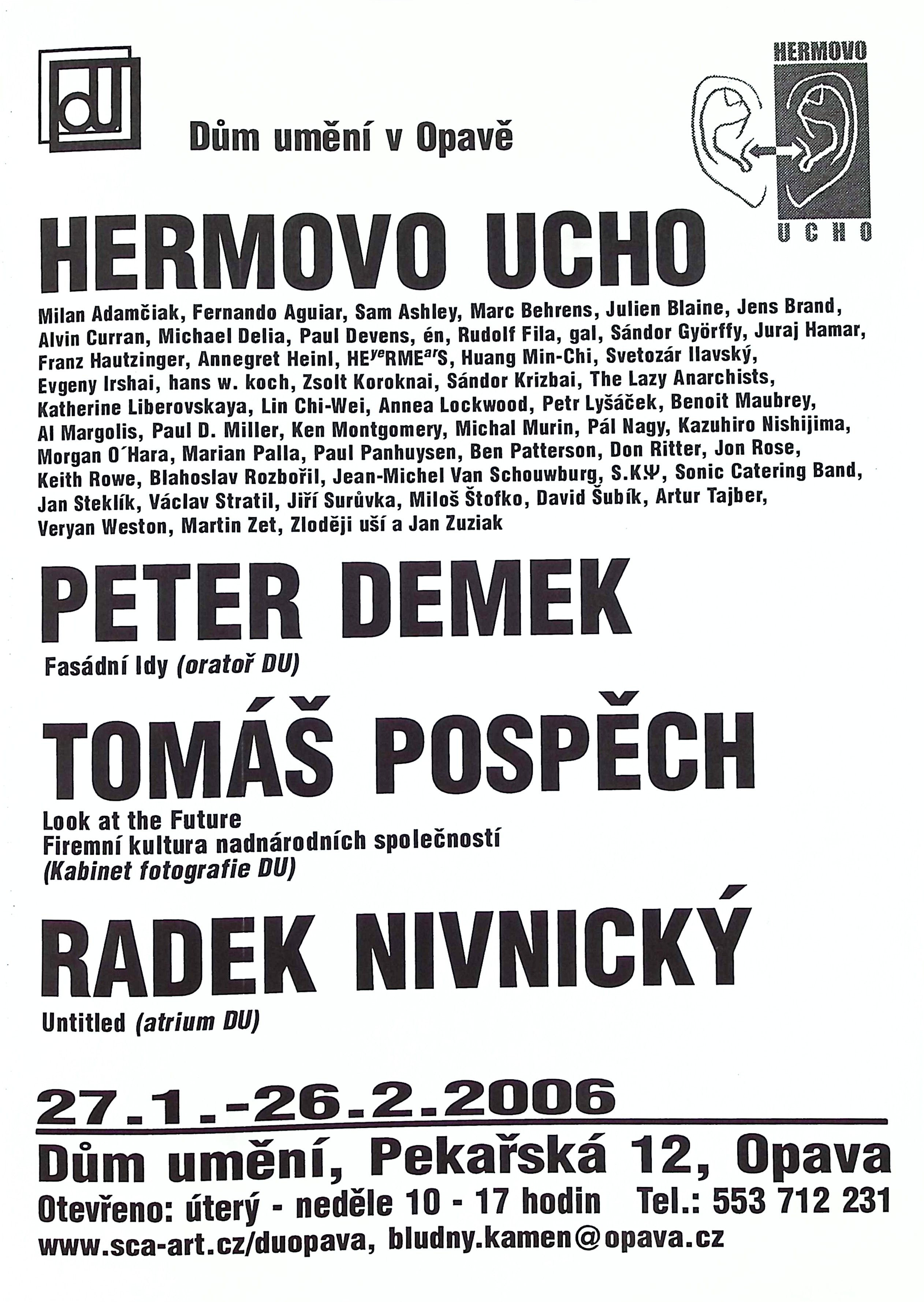 Hermovo ucho - Milan Adamčiak, Fernando Aguiar, Sam Ashly, Marc Behrens, Julien Blaine, Jens Brand, Alvin Curran, Michael Delia, Paul Devens, én, Rudolf Fila, gal, Sándor Györffy, Juraj Hamar, Franz Hautzinger, Annegret Heinl, HEyeRMEarS, Huang Min-Chi, Svetozár Ilavský, Evgeny Irshai, hans v. koch, Zsolt Koroknai, Sándor Krizbai, The Lazy Anarchists, Katherine Liberovskaya, Lin Chi-Wei, Annea Lockwood, Petr Lysáček, Benoit Maubrey, Al Margolis, Paul D. Miller, Ken Montgomery, Michal Murin, Pál Nagy, Kazuhiro Nishijima, Morgan O´Hara, Marian Palla, Paul Panhuysen, Ben Pattreson, Don Ritter, Jon Rose, Keith Rowe, Blahoslav Rozbořil, Jean-Michel Van Schouwburg, S.K.Y, Sonic Catering Band, Jan Steklík, Václav Stratil, Jiří Surůvka, Miloš Štofko, David Šubík, Artur Tajber, Veryan Weston, Martin Zet, Zloději uší a Jan Zuziak, Peter Demek - Fasádní Idy, Tomáš Pospěch - Look at the Future, Radek Nivnický - Untitled