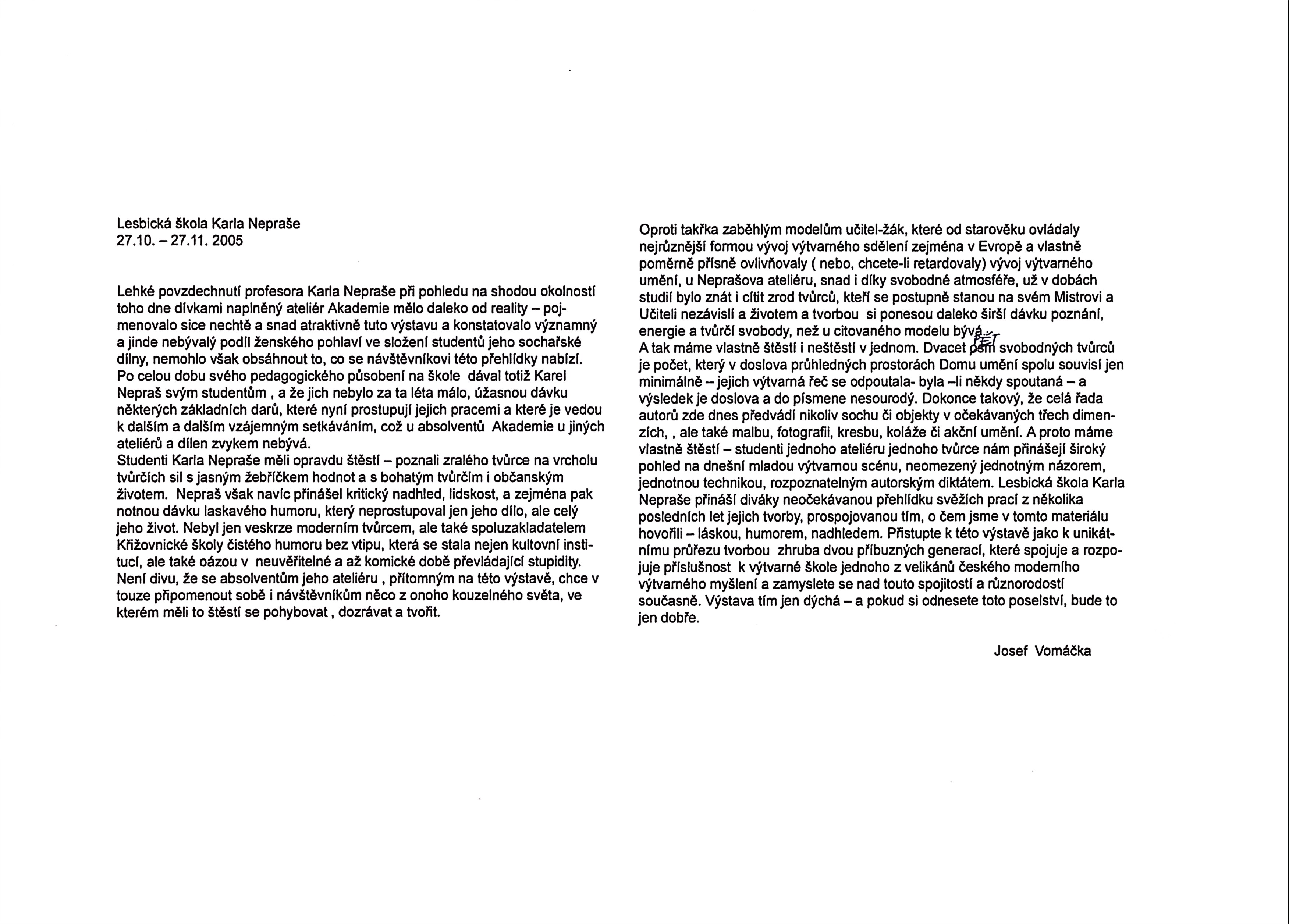 Lesbická škola Karla Nepraše - Karel Bartáček, Simona Blahutová, Filoména Borecká, Jan Cíleček, Jana Doubková, Martina Hozová, Zdenek Chmelař, Klára Klose, Kateřina Kociánová, Markéta Korečková, Lenka Kortánková, Ján Macko, Aleš Makarenko, Václav Mandelík, Martina Niubo, Michal Novotný-Micl, Vít Novotný, Miroslav Pánek, Jan Pospíšil, Vlasta Samohrdová, Paulina Škávová, Zdeněk Šmíd, Benedikt Tolar, Lukáš Wágner