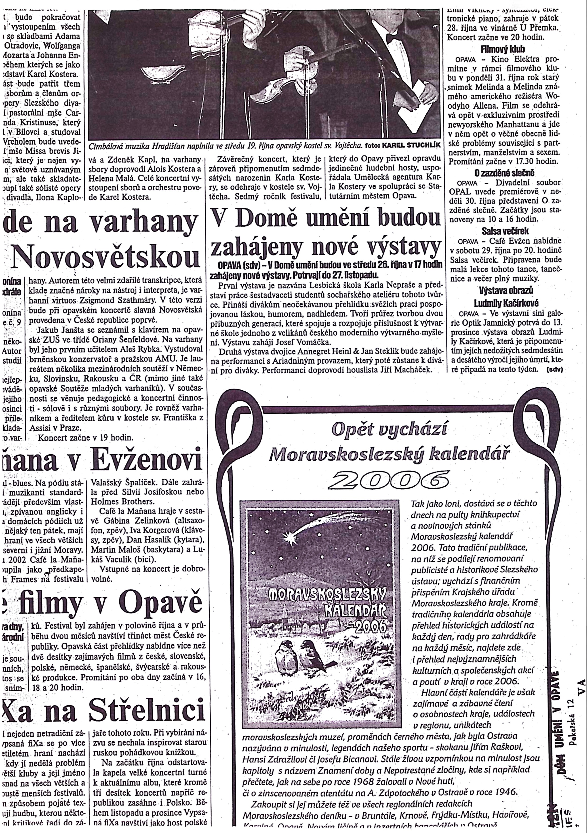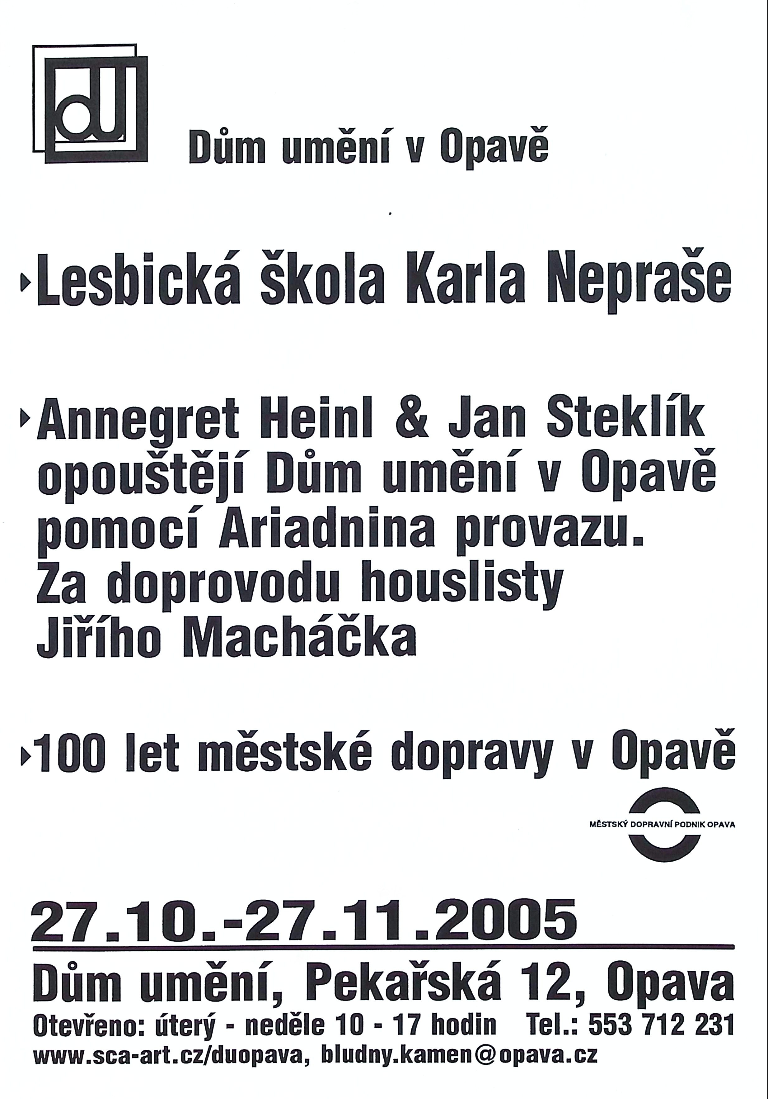 Lesbická škola Karla Nepraše - Karel Bartáček, Simona Blahutová, Filoména Borecká, Jan Cíleček, Jana Doubková, Martina Hozová, Zdenek Chmelař, Klára Klose, Kateřina Kociánová, Markéta Korečková, Lenka Kortánková, Ján Macko, Aleš Makarenko, Václav Mandelík, Martina Niubo, Michal Novotný-Micl, Vít Novotný, Miroslav Pánek, Jan Pospíšil, Vlasta Samohrdová, Paulina Škávová, Zdeněk Šmíd, Benedikt Tolar, Lukáš Wágner, Annegret Heinl a Jan Steklík - Adrianin provaz, 100 let městské dopravy v Opavě