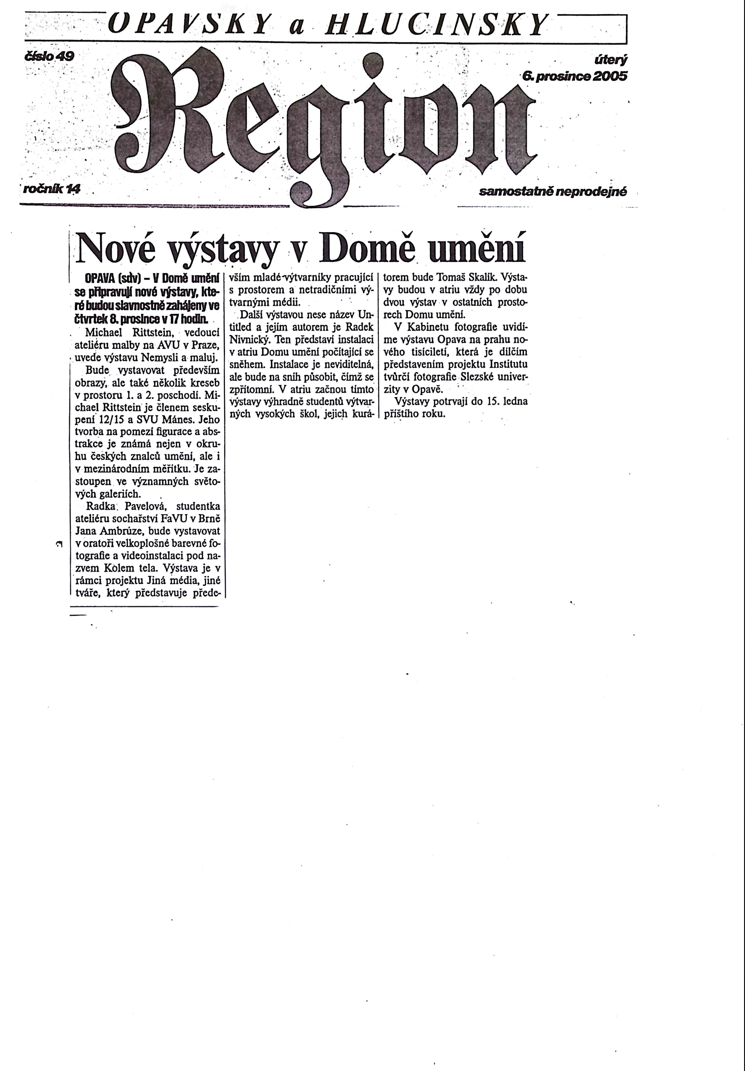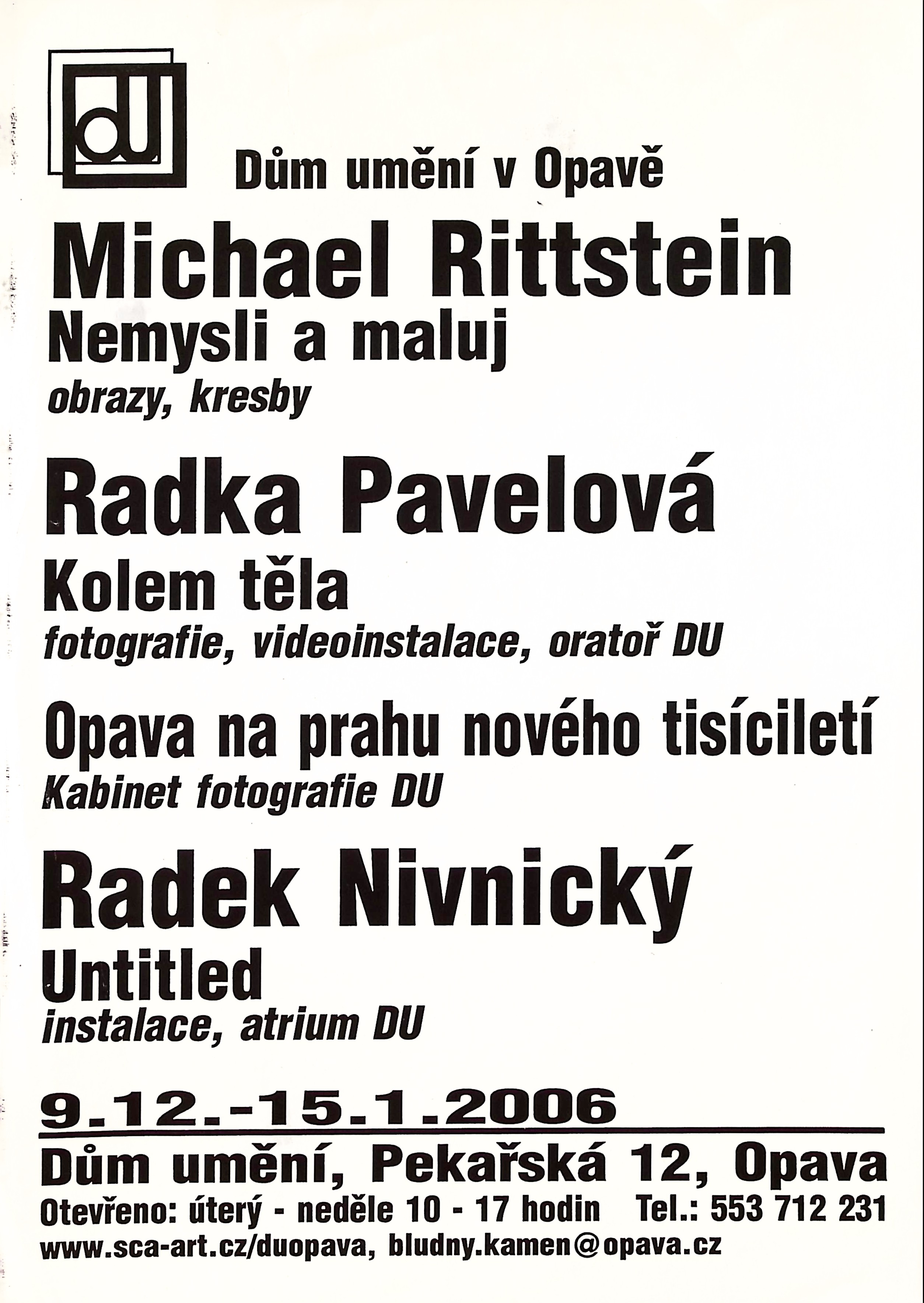 Michael Rittstein - Nemysli a maluj, Radka Pavelová - Kolem těla, Opava na prahu nového tisíciletí - studenti ITF SU v Opavě - Jan Langer, Milon Illík, Jan Konvička, Marek Malůšek, David Macháč, Krzysztof Gotucha, Michal Popieluch, Krzysztof Szefczyk, Laura Witleková..., Radek Nivnický - Untitled