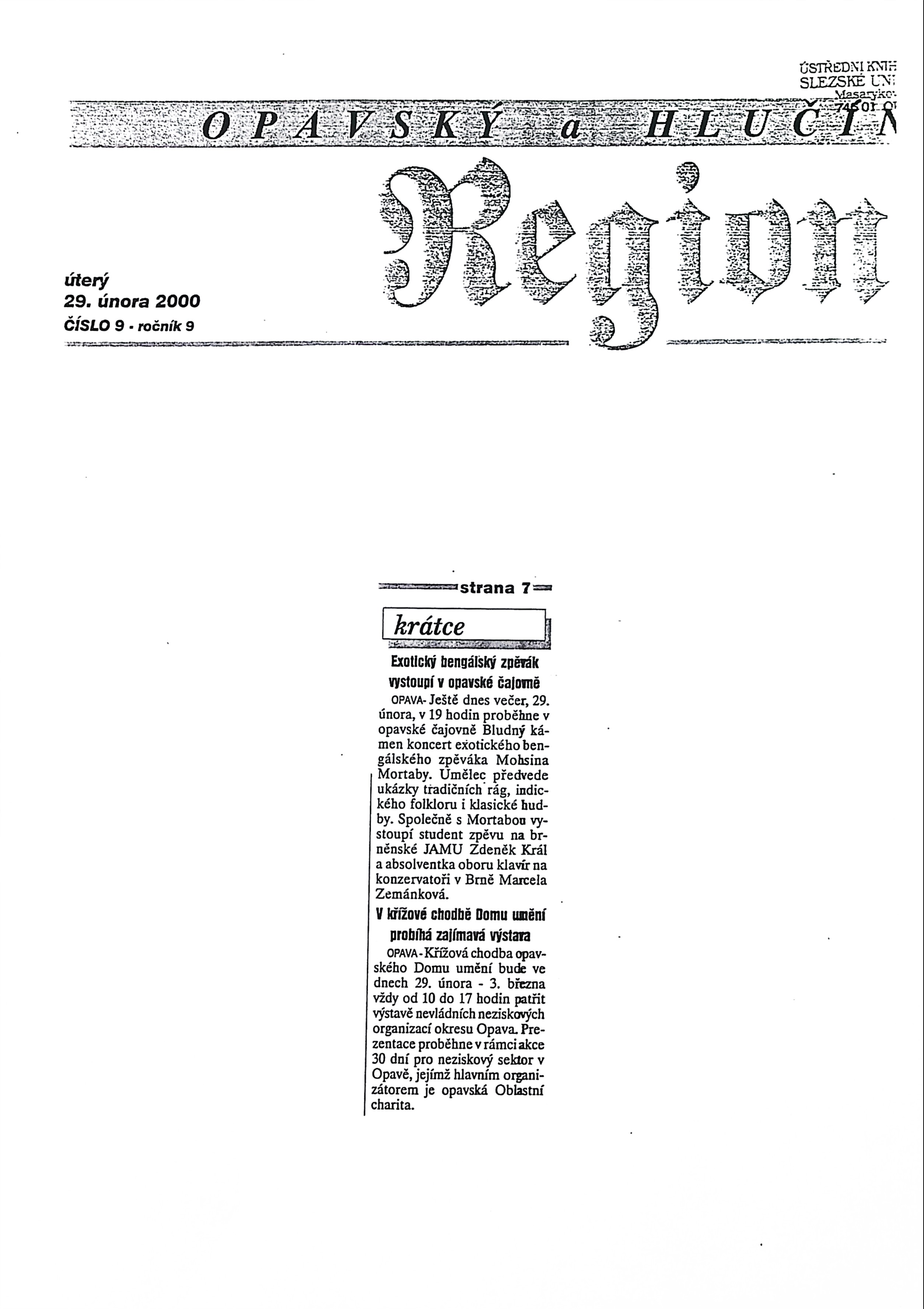 datum 2000-02-29 místo Čajovna druh akce Koncert etapa Dům umění (1999–2008) vystavující/vystupující Mohsin Mortaba Zdeněk Král Marcela Zemánková popis Mohsin Mortaba - koncert