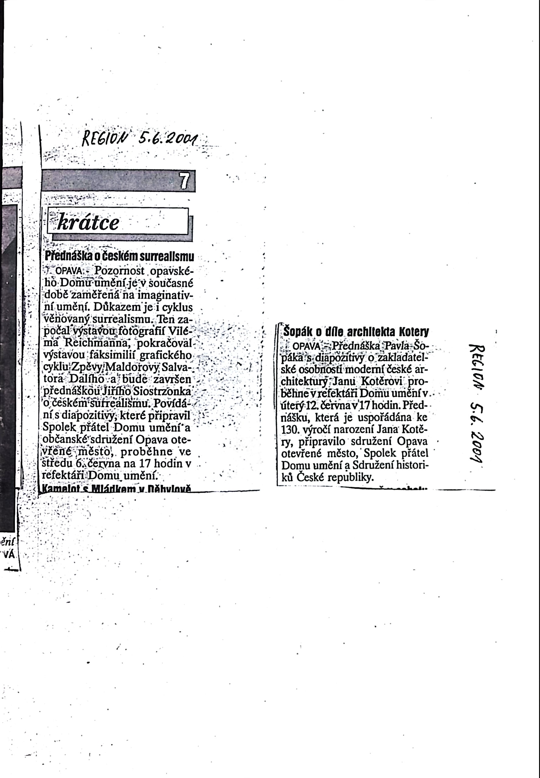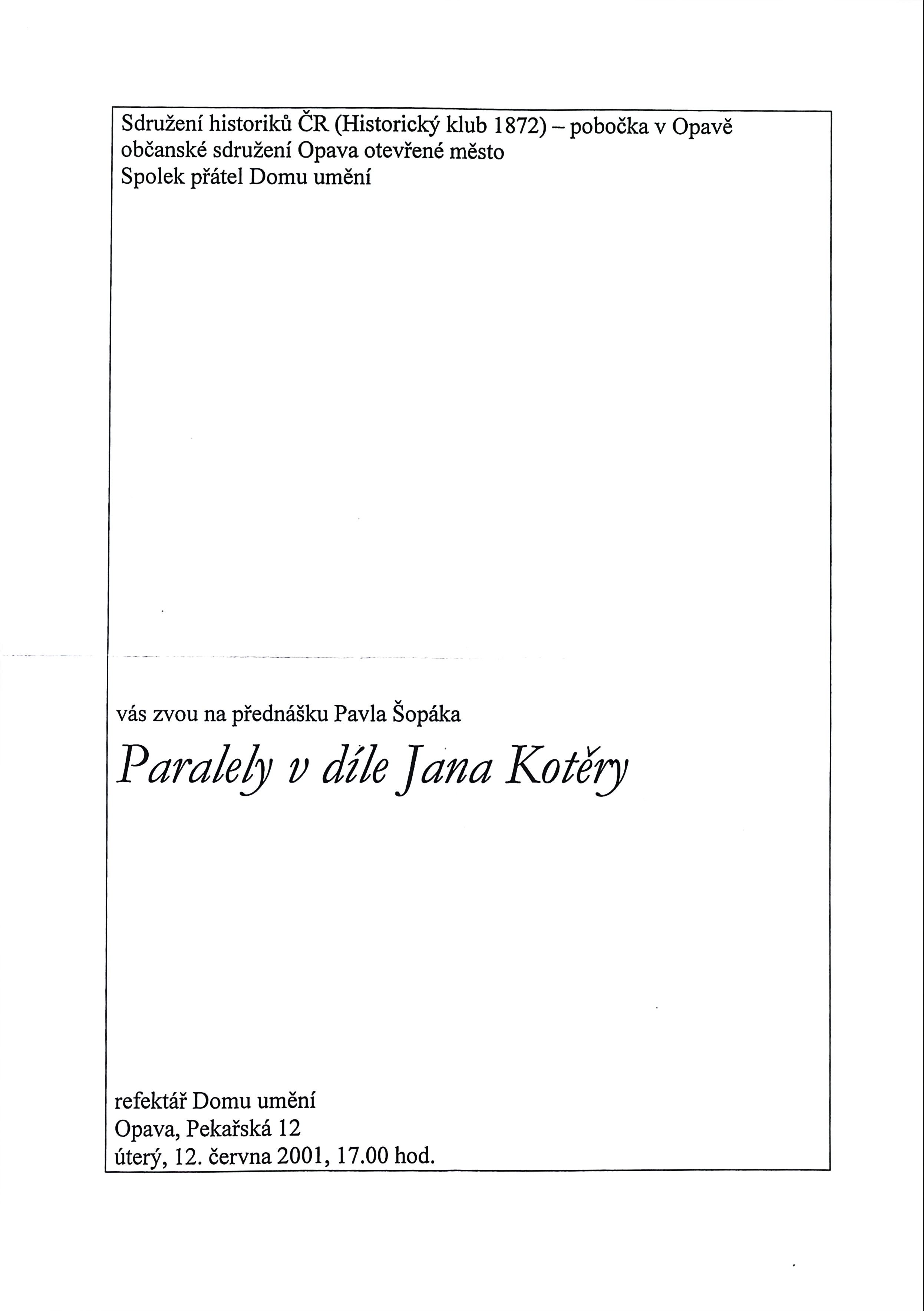 datum 2001-06-12 místo Dům umění v Opavě druh akce Přednáška etapa Dům umění (1999–2008) popis Pavel Šopák - Paralely v díle Jana Kotěry