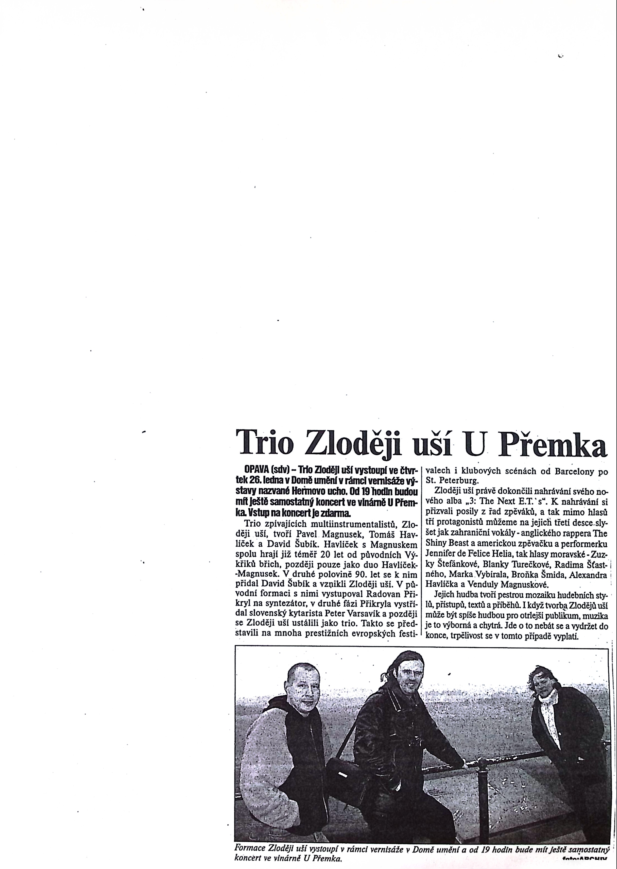 datum 2006-01-26 místo Dům umění v Opavě druh akce Koncert etapa Dům umění (1999–2008) vystavující/vystupující Pavel Magnusek Tomáš Havlíček David Šubík popis Zloději uší